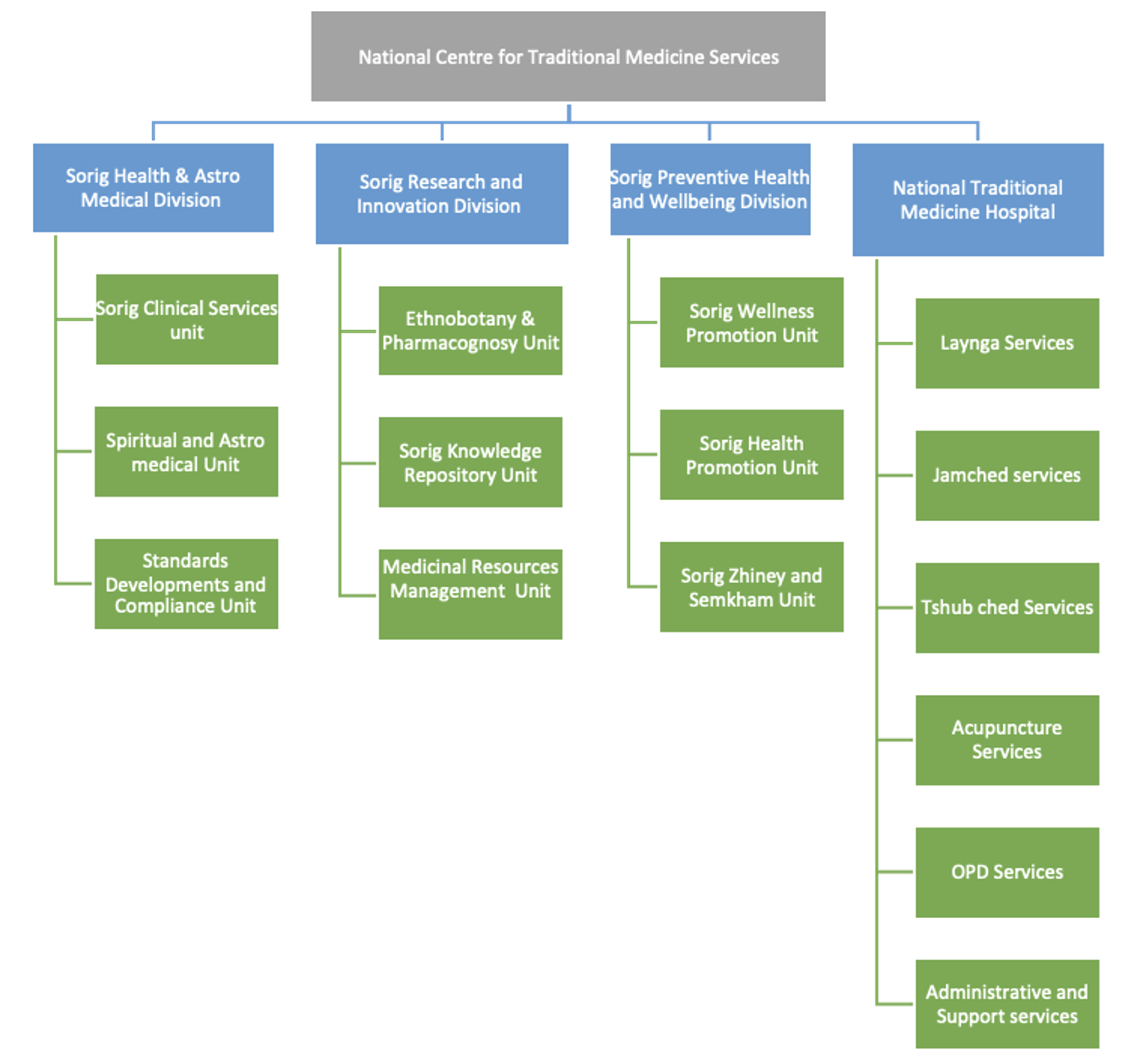 The erstwhile Department of Traditional Medicine Services (DTMS) was established in accordance with the Cabinet’s directives issued vide letter No. C-3/148/398 dated 15th January 2013. The Department was constituted with three functional divisions, including the National Traditional Medicine Hospital (NTMH) and the Menjong Sorig Pharmaceuticals Corporation Limited (MSPCL), to strengthen, coordinate, and advance Traditional Medicine services across the country.
